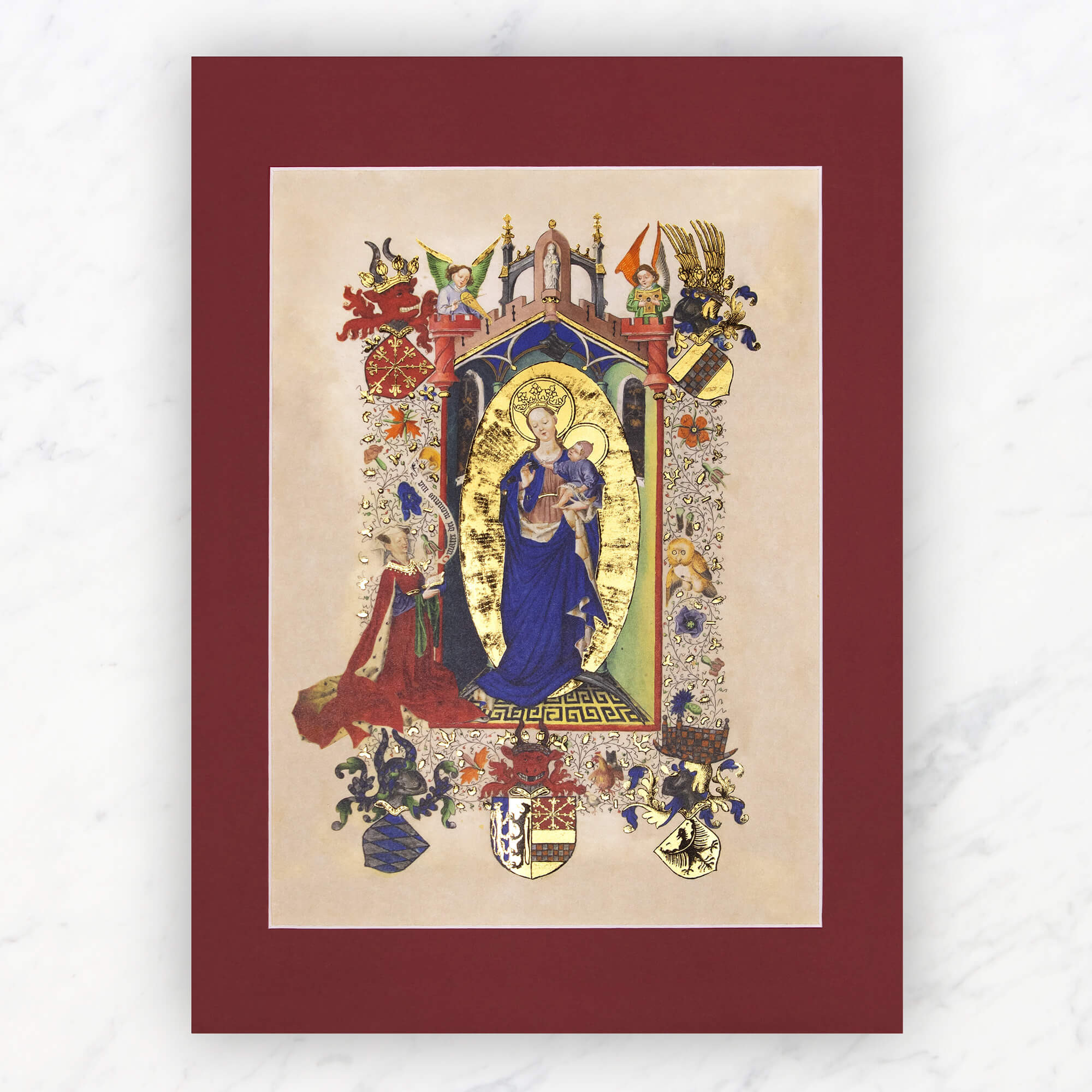 Cette miniature en pleine page inaugure le livre d’heures dit De Catherine de Clèves, dont elle demeure l’une de ses enluminures les plus éblouissantes. Elle figure la prière du matin à Notre-Dame. Catherine de Clèves y est représentée se recueillant devant une Vierge à l’Enfant, en robe rouge, son livre d’heures entre les mains. Une supplique en latin, inscrite sur une banderole, semble s’élever du livre vers la Vierge : O MATER DEI MEMENTO MEI**. Enchâssée dans l’encadrement d’un édifice gothique richement coloré, la Vierge se tient, posée sur croissant de lune***, sous le regard bienveillant de deux anges musiciens. Les blasons peints dans les coins de la page et en-dessous de la Vierge sont ceux de la famille de Catherine de Clèves et de ses ancêtres. Les armes de la famille de Catherine de Clèves sont privilégiées, dans tout l’ouvrage, relativement à celles de son mari. Dans un acte de défiance, peut-être, envers le duc de Gueldre ? Dans cette page, on distingue aussi, cachés parmi les décorations florales des marges, deux dessins d’oiseaux : à droite, une chouette et un coq, dans la partie inférieure.