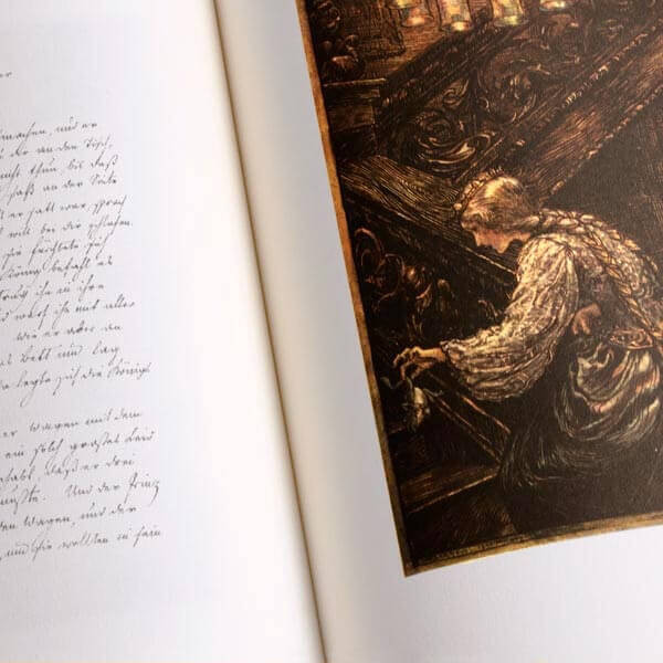 Nesta edição, as páginas manuscritas dos irmãos Grimm interagem com as ilustrações icônicas de Arthur Rackham.