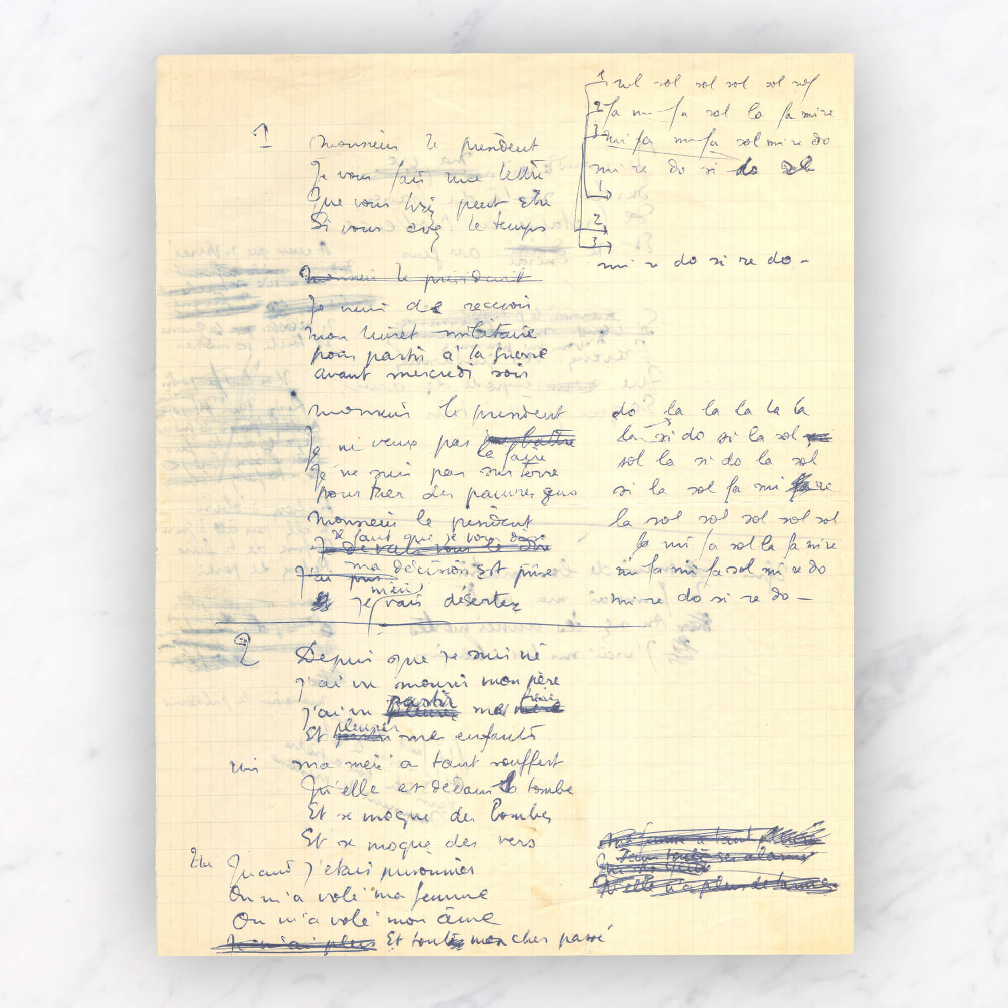Boris Vian accepte de transformer son texte. « Monsieur le Président » devient « Messieurs qu’on nomme grands… » afin de ne pas apostropher directement le chef du gouvernement. Et en studio, Vian garde la fin pacifiste :