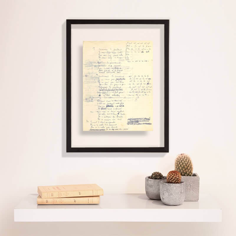 Document recto-verso présenté dans un cadre entre-deux-verres (33 cm x 43 cm).